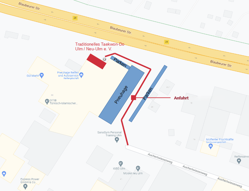 über Jägerstraße einbiegen in Auchertwiesenweg 22 89081 Ulm/Söflingen am Ende der Straße im Pneuhage Reifenzentrum, rechter Nebeneingang 2. Stock. Die blauen Bereiche in der Karte sind Parkbereiche.